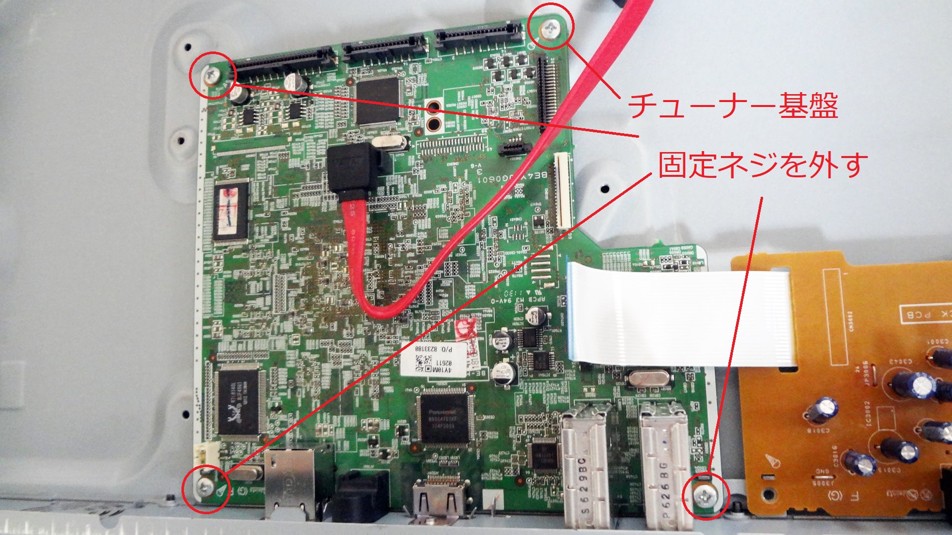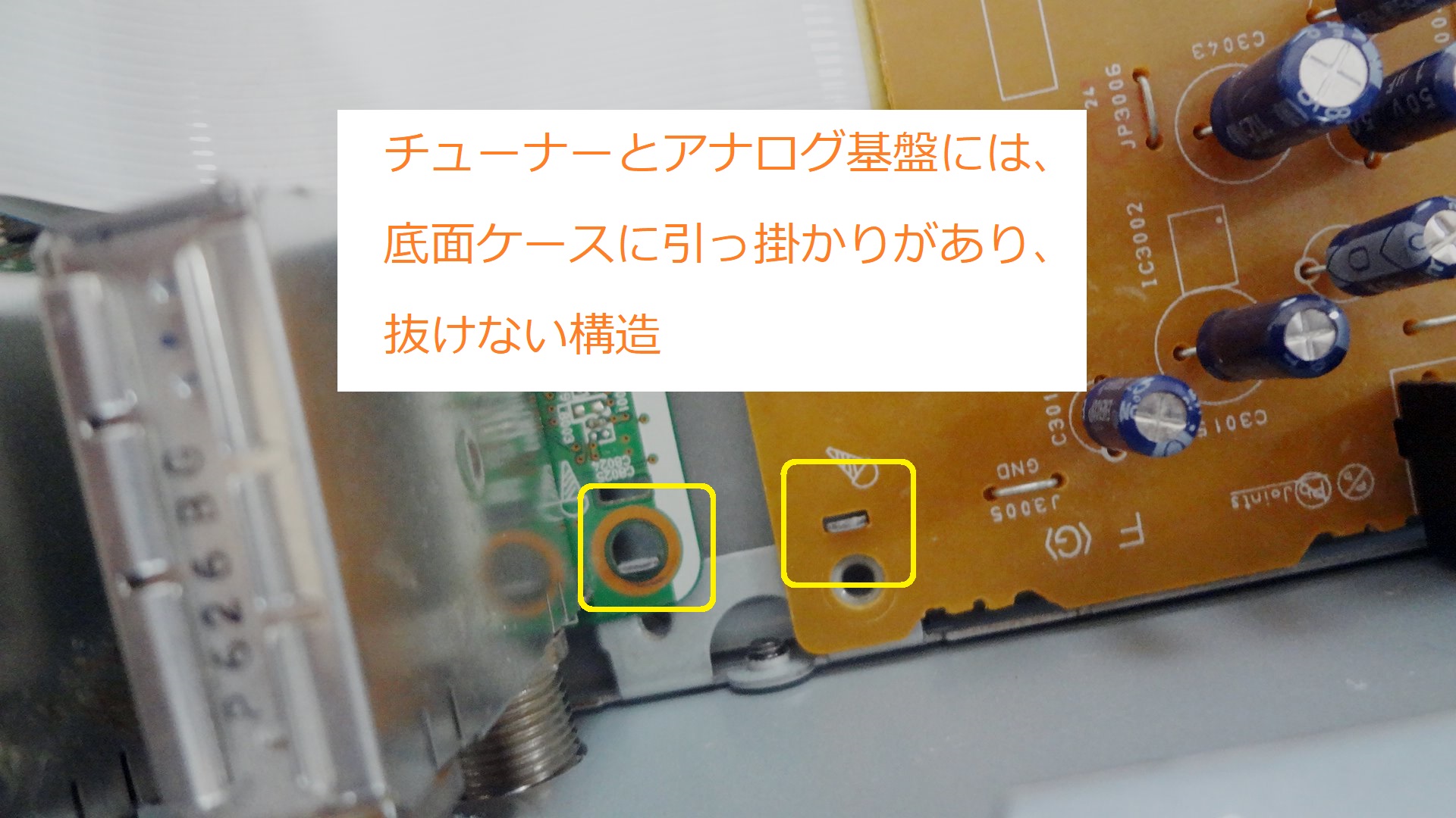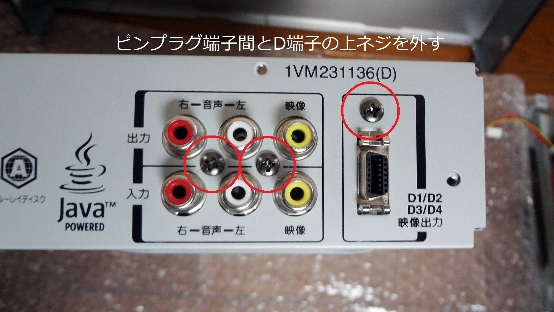 この基盤は本体裏面のネジも外さないと外れません。裏面の映像音声出力端子のピンジャック端子間の黒色タッピングネジ(長)2本と、D端子上にある黒色タッピングネジ(長)1本の、計3本のネジを外します。