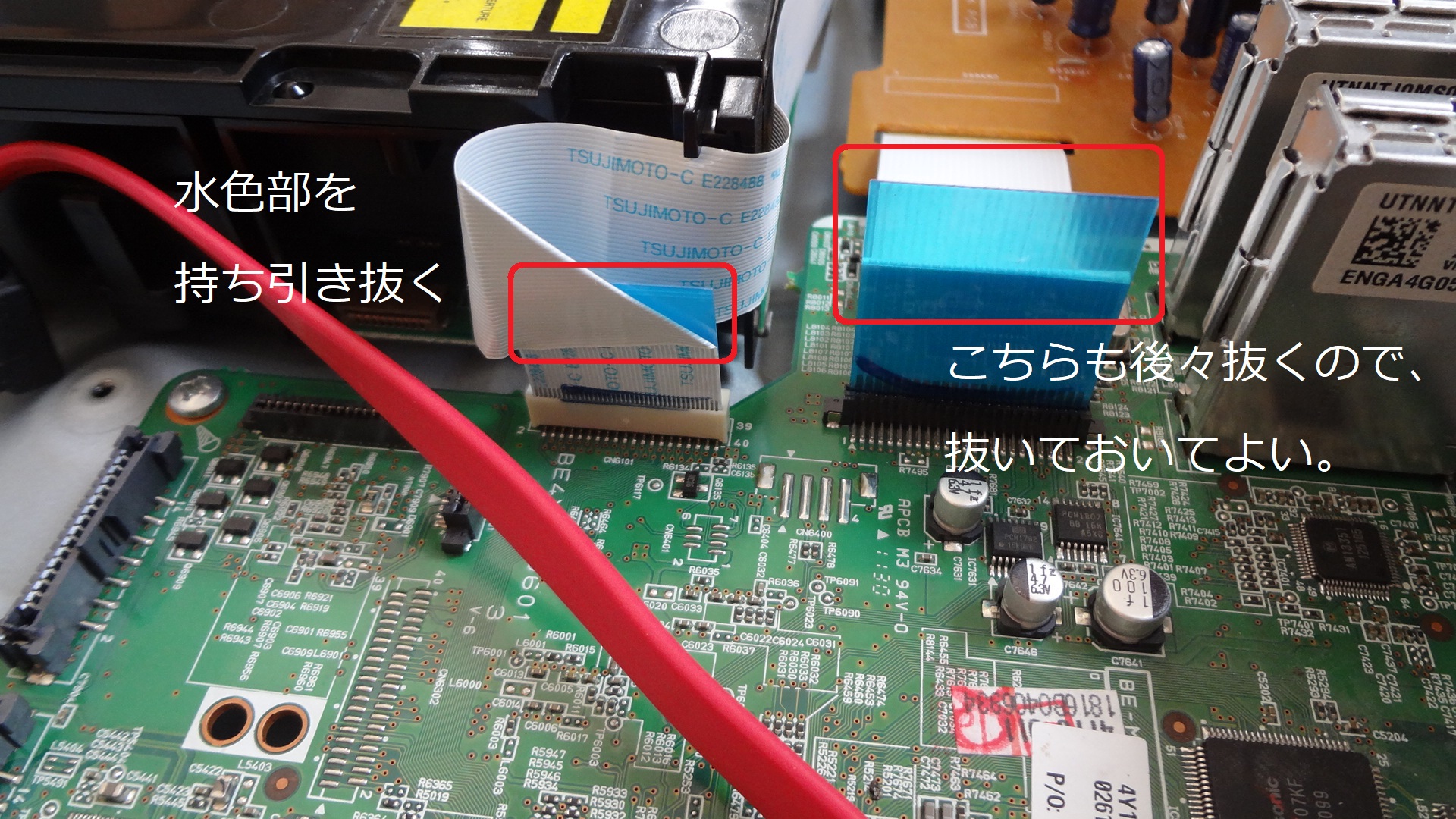 手順⑭で外していなければ緑色のチューナー基盤に差さっている白色のフィルムケーブルを水色の丈夫な部分を持ち引き抜きます。