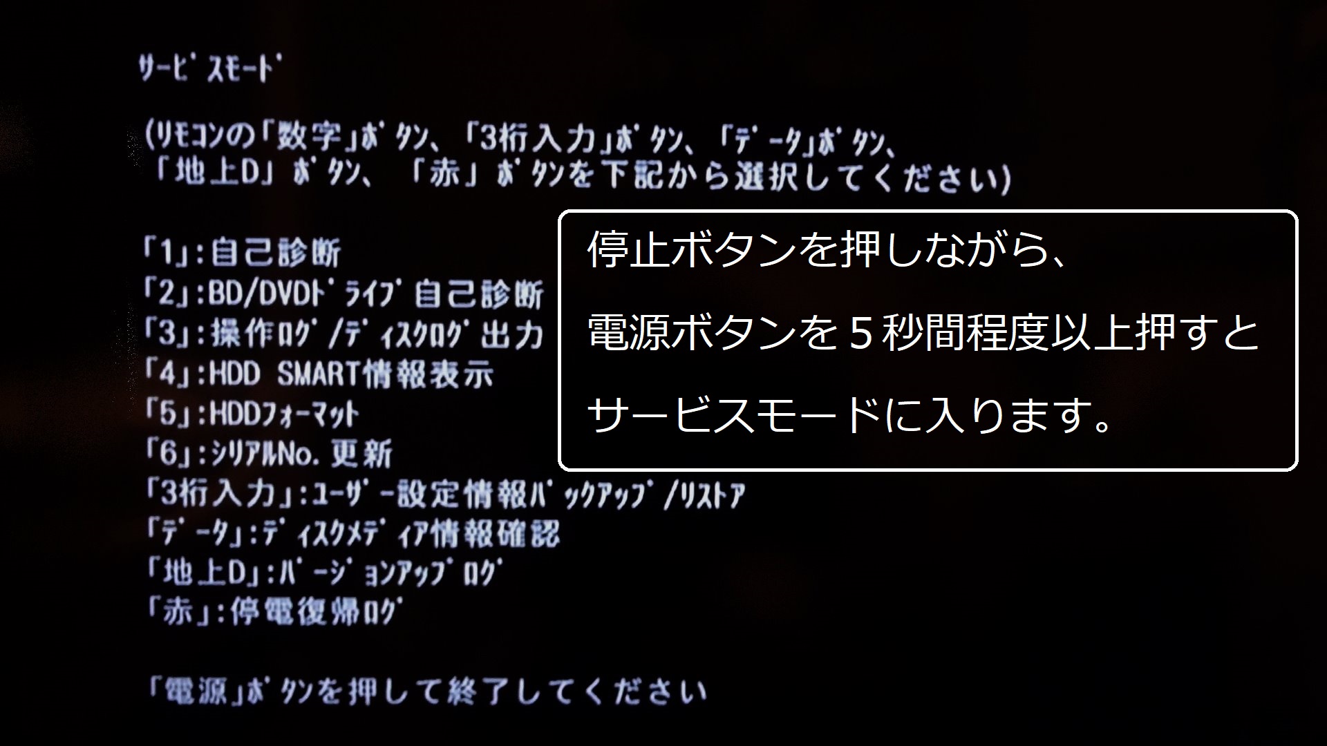 本体電源オフ状態で本体の「停止ボタン□」を押したままで「電源」スイッチを10秒以上長押しすると、サービスモードに入ります。