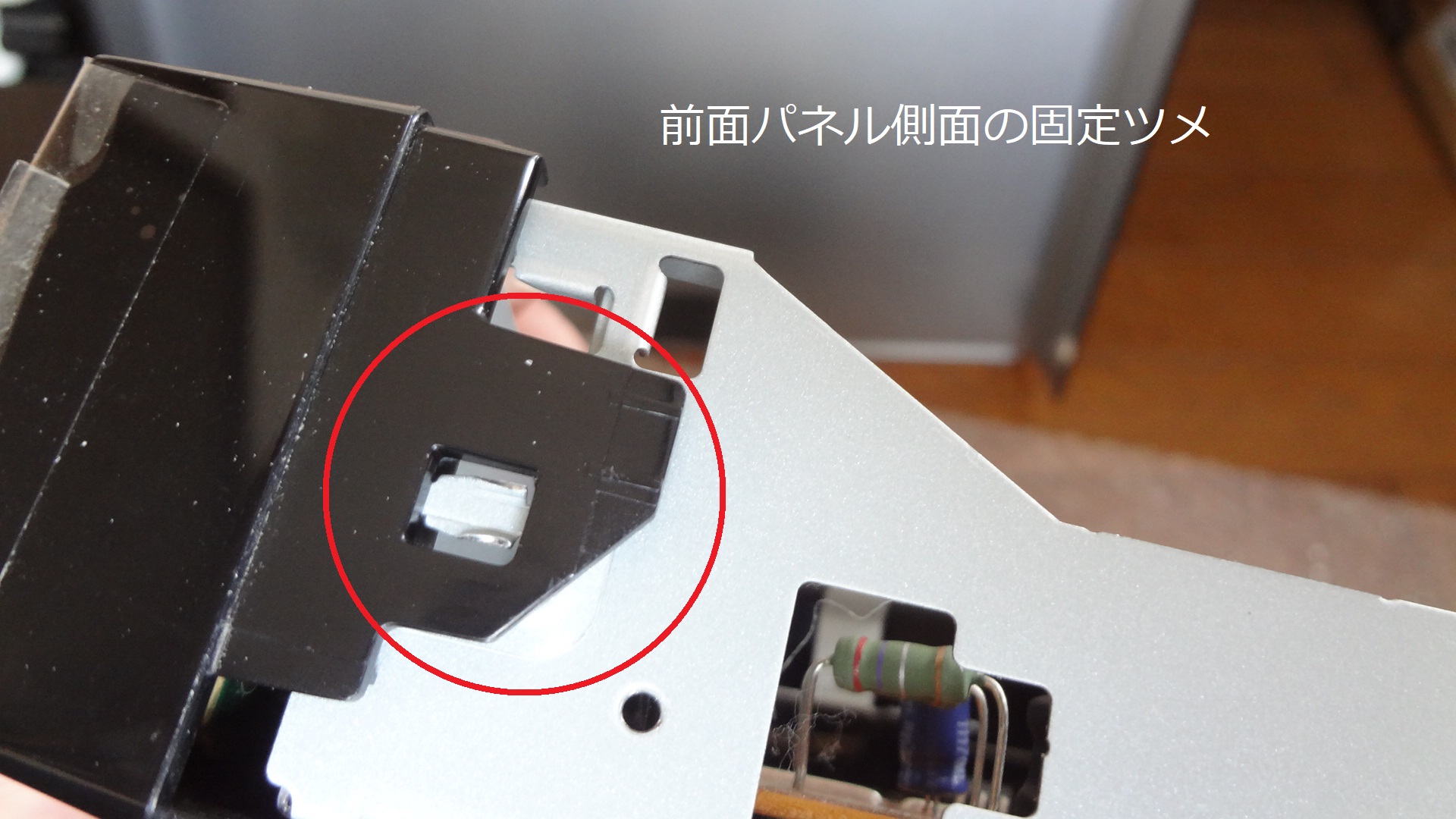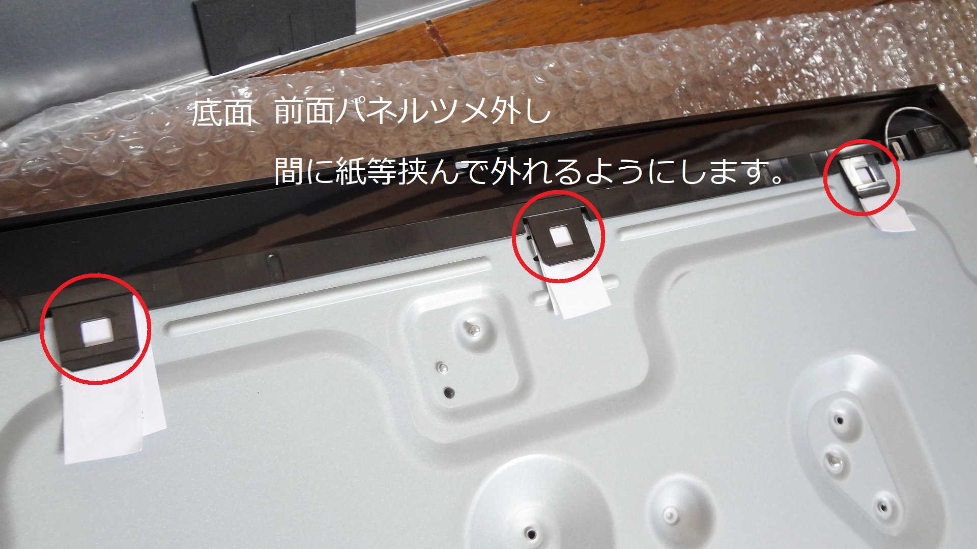 ③前面パネルは7ヶ所のツメで止まっていますので、ロックツメを全部浮かします。