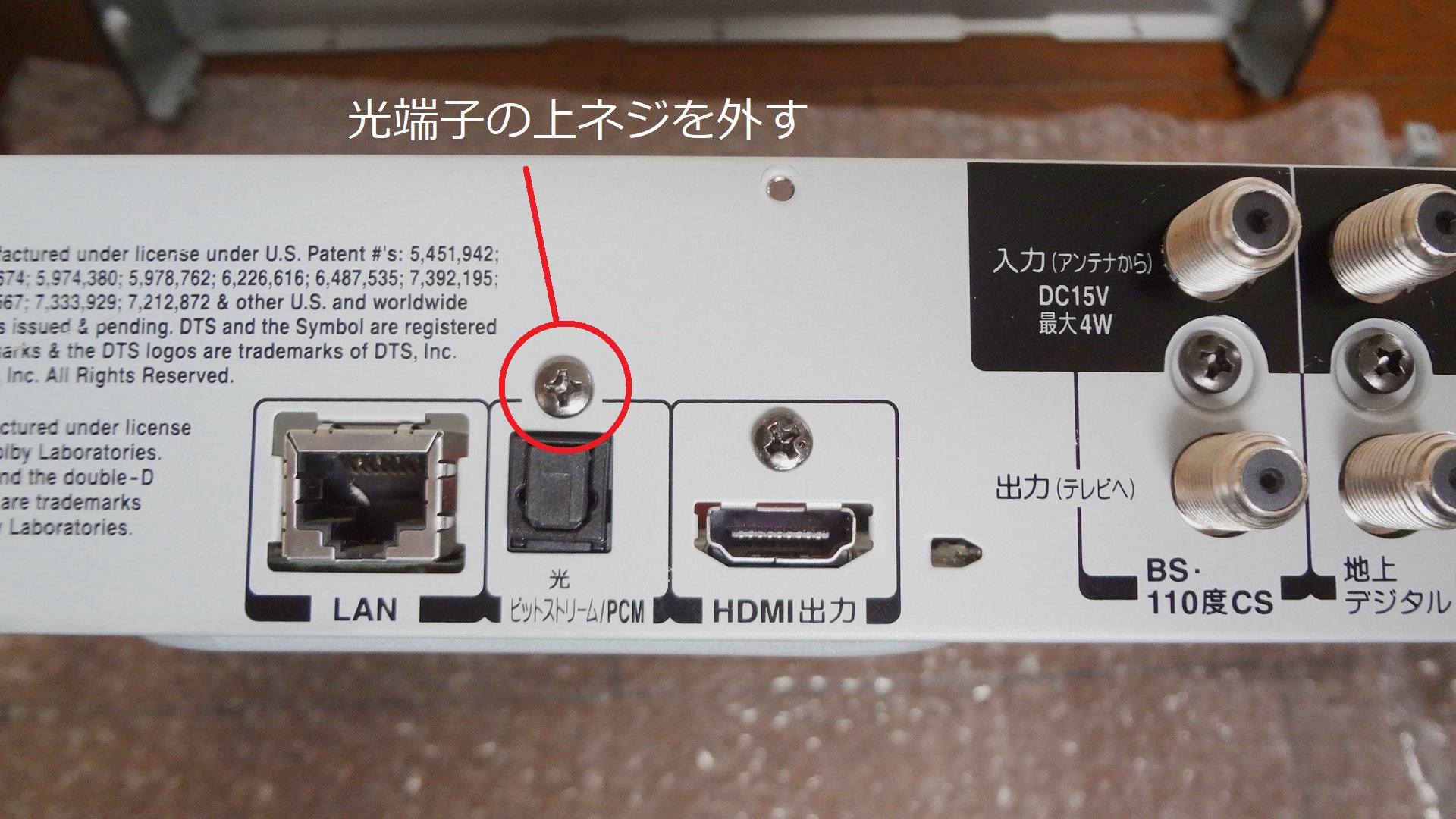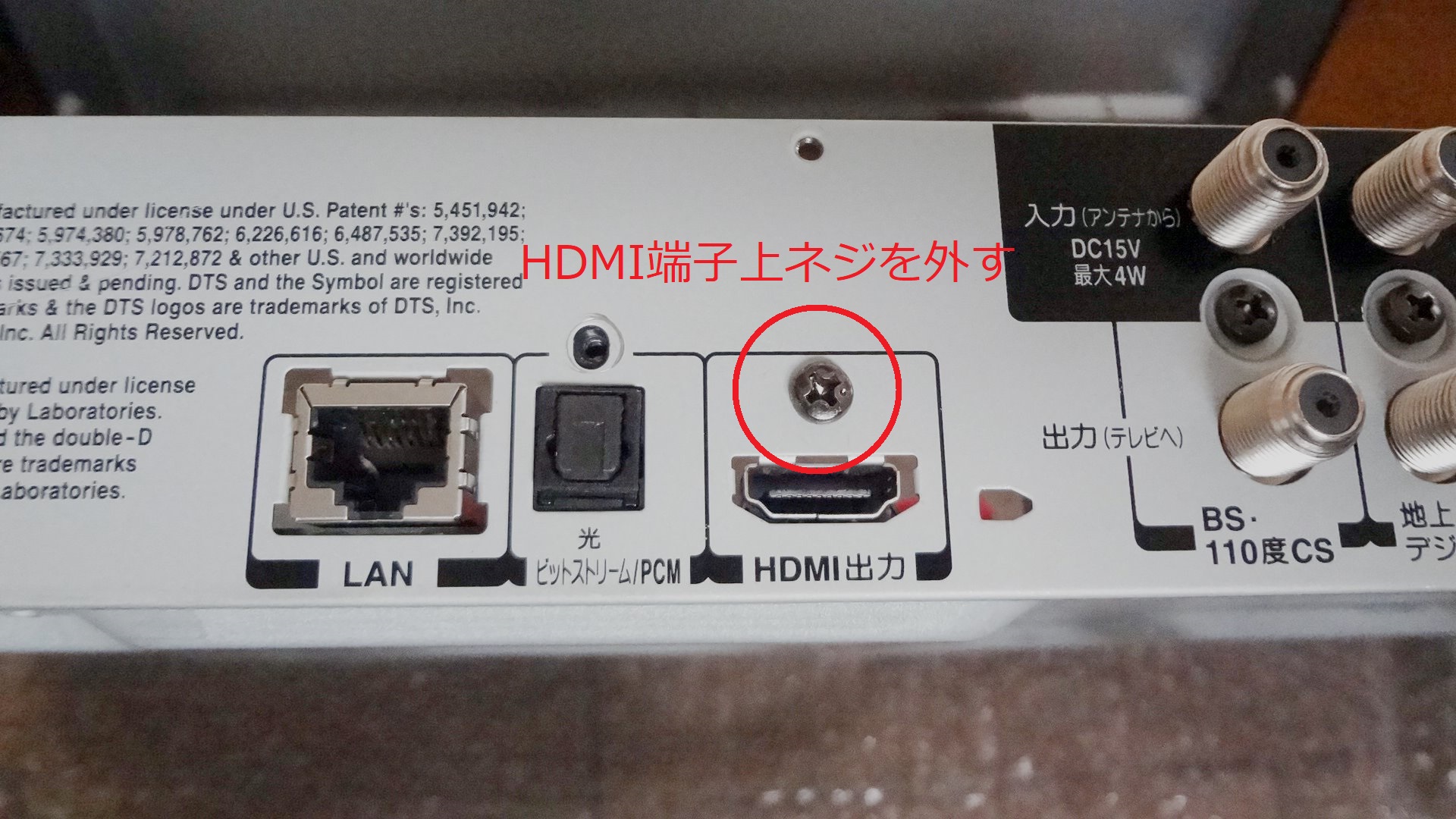 HDMI端子上の黒色ナベネジ(短)1本と、光端子上の黒色タッピングネジ(長)1本を外します。