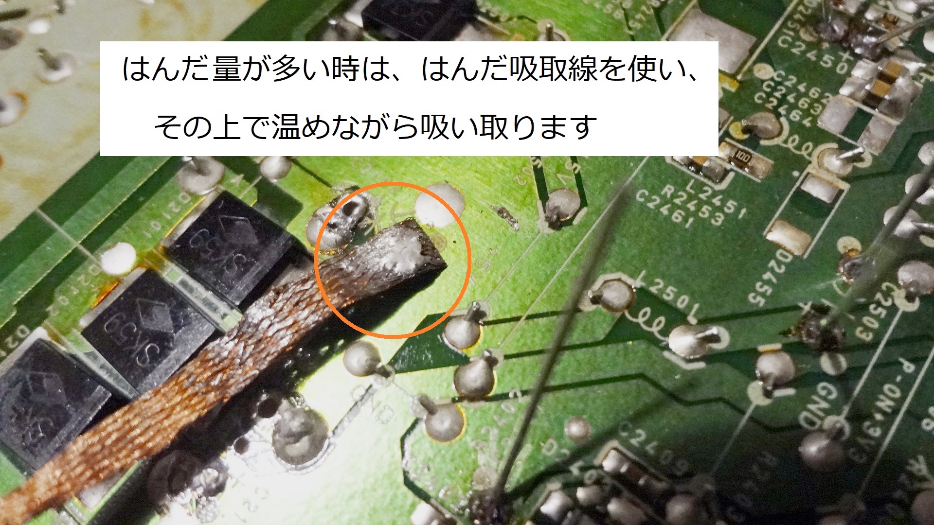 ・外すにあたってははんだ量が少ない所は、部品の足が出ている丸い形状部分の「ランド」と呼ばれる部分に、はんだこてをあてても中々溶けないので、呼びはんだと言って新たなはんだを足してやることで溶けます。