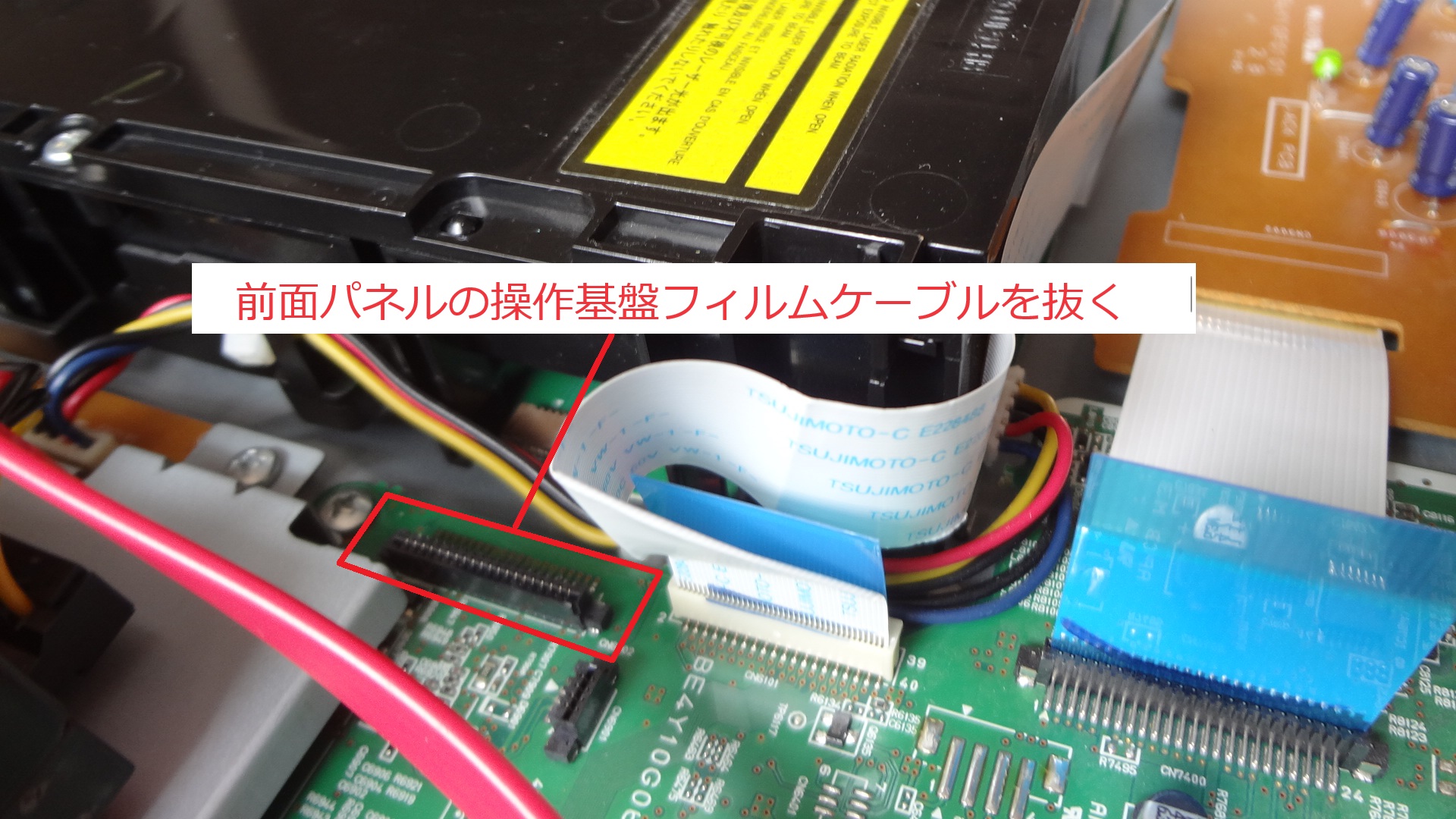 まず、前面パネルにつながっている白いフラットケーブルを抜きます。HDDとBDドライブ間にある幅の狭い方の根元に見える丈夫な水色部分を引っ張って抜きます。