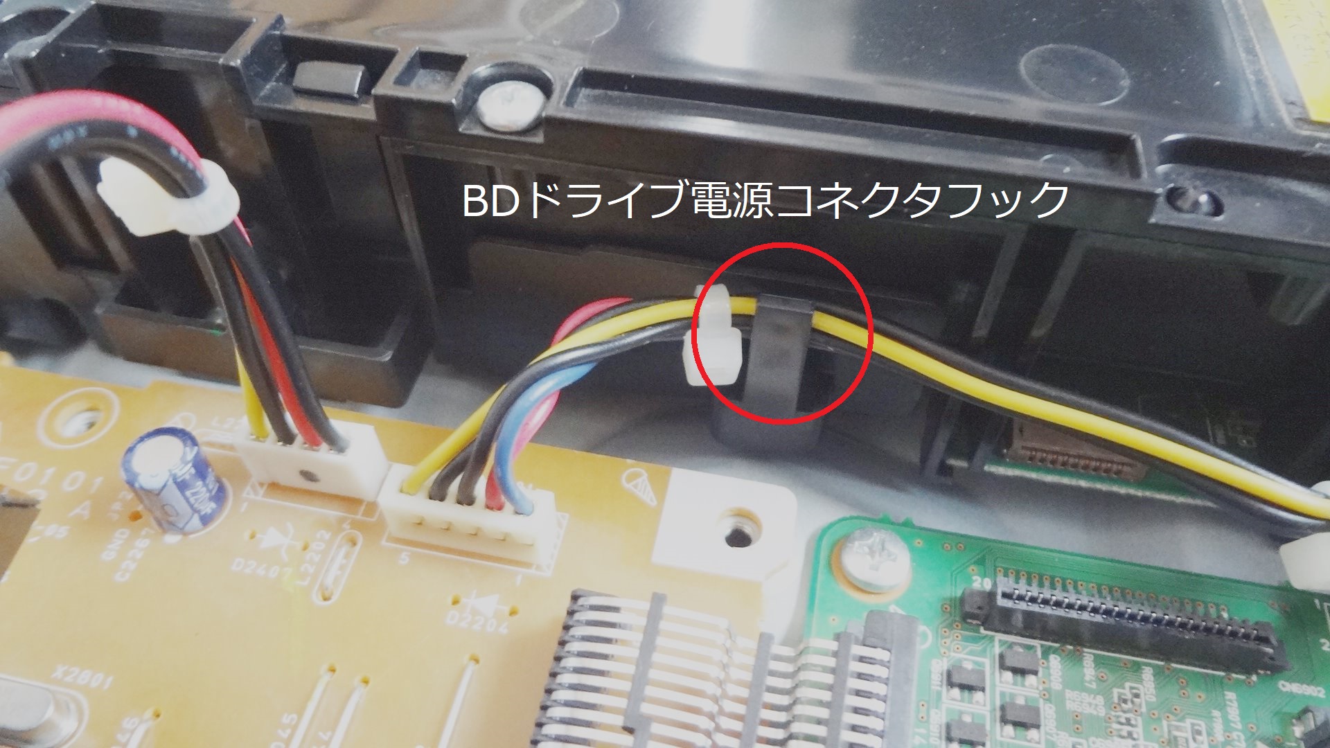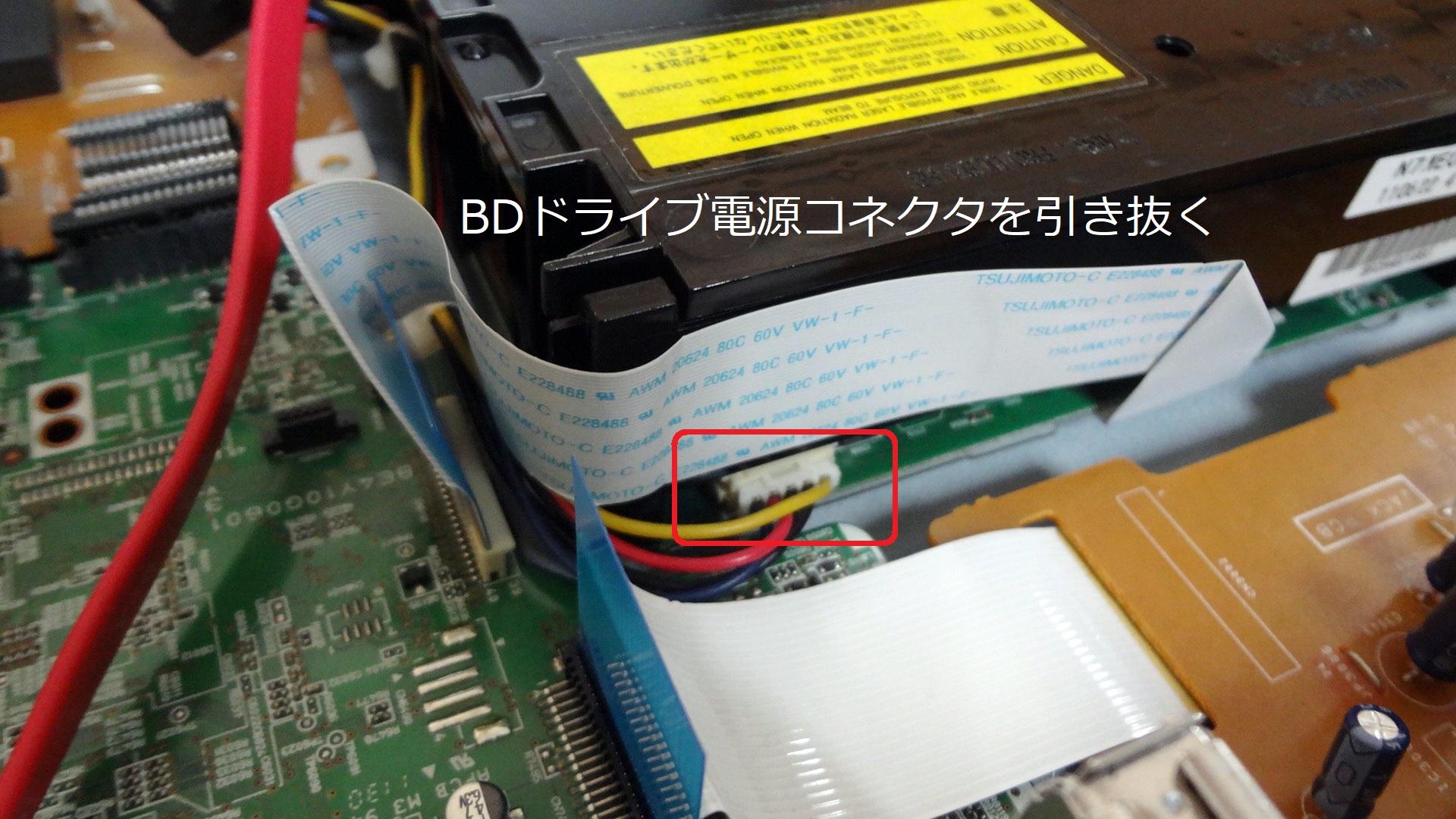 BDドライブ裏面の白いコネクタを抜きます。(先にドライブを外した方が楽かもしれません。)