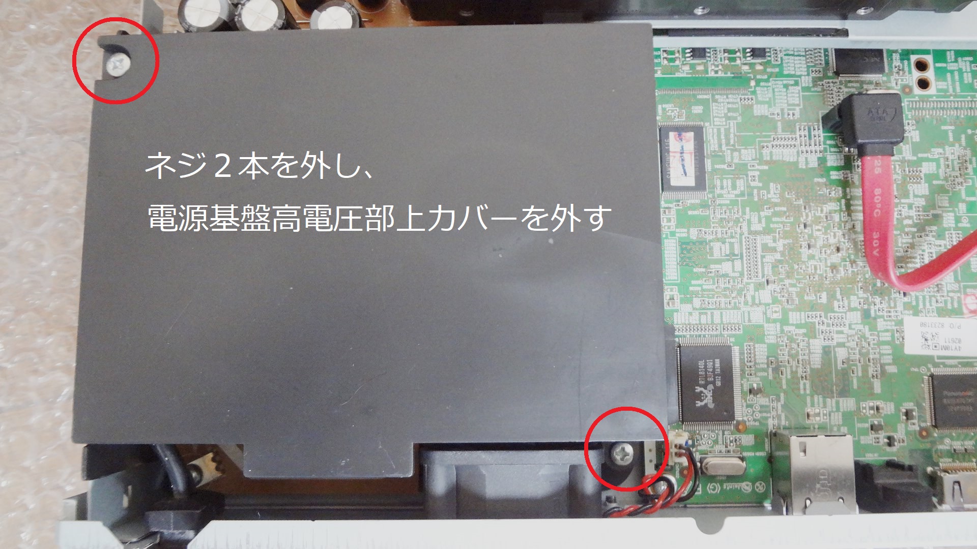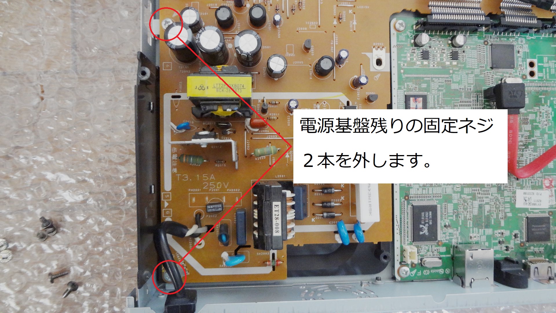 ⑪先ほどのHDD固定ネジ5本が電源基盤と共締めになっていたので、電源基盤は電源コードと黄色いトランスの近くにある残りのナベネジ(長)2本を外します。