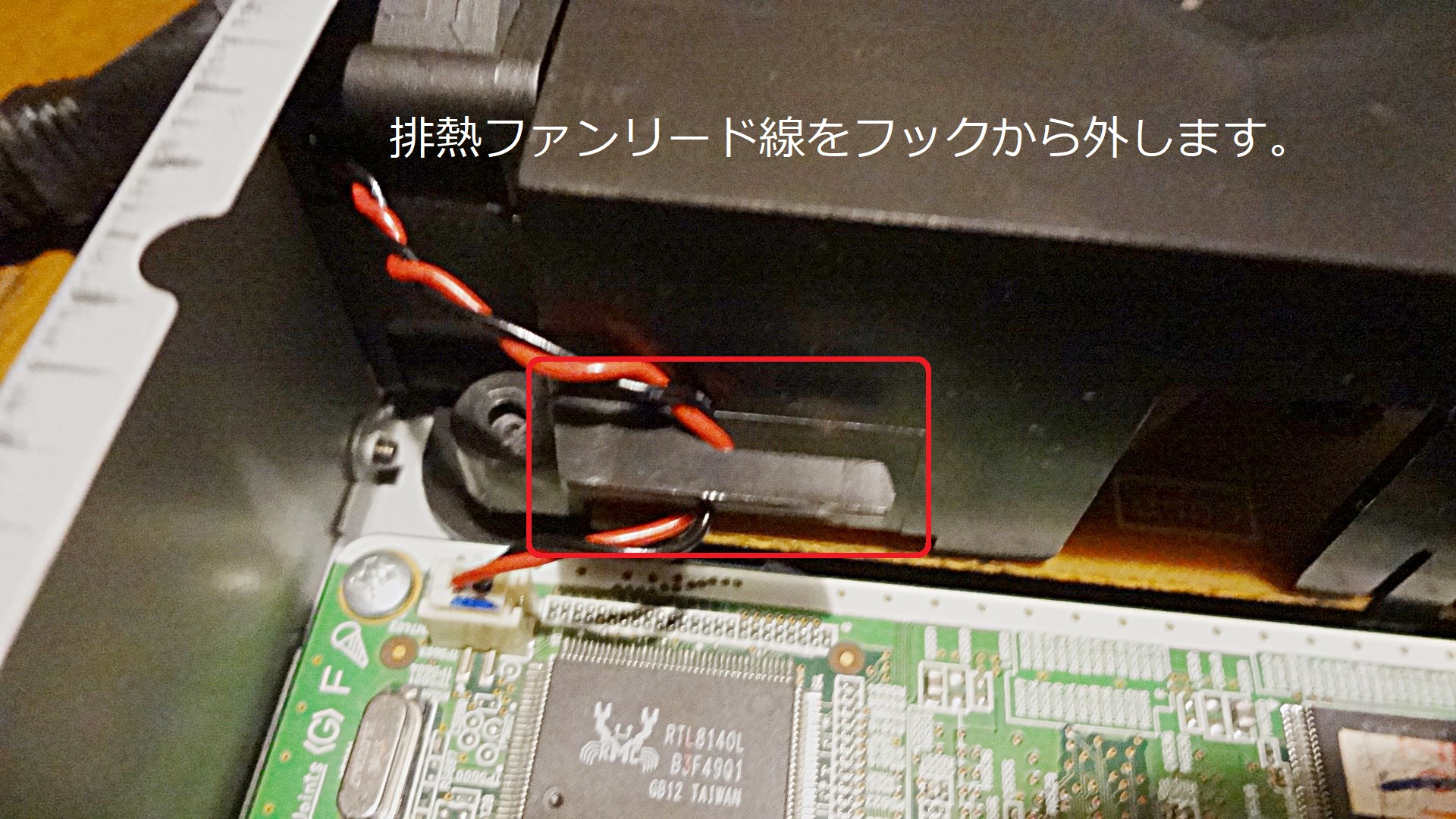 ⑥電源基盤にある黒色四角形の樹脂製の高電圧部のカバーを外しますが、先にこのカバーの側面にファンの赤黒色線が引っ掛けてあるので外します。