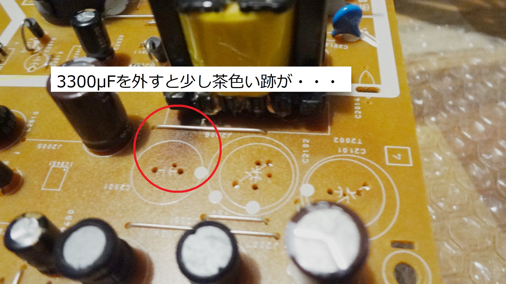 まず初めに気になる3300μFを外すと基盤面がやや茶色になっていて怪しい兆候でした。いずれ起動しなくなる所だったかもしれません・・・。