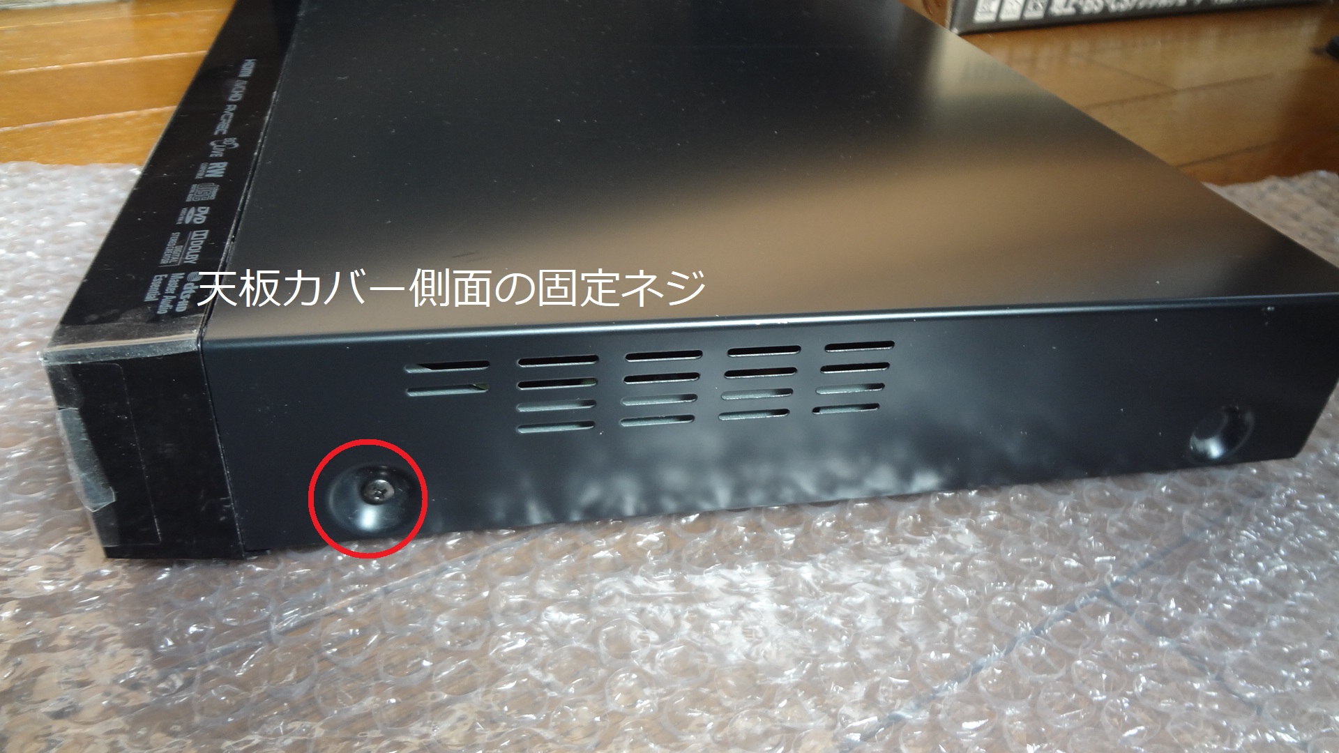 左右側面各1ヶ所、裏面5ヶ所の計7本の黒色ナベネジ(短)を外し、天板カバーを後方へスライドさせて外します。