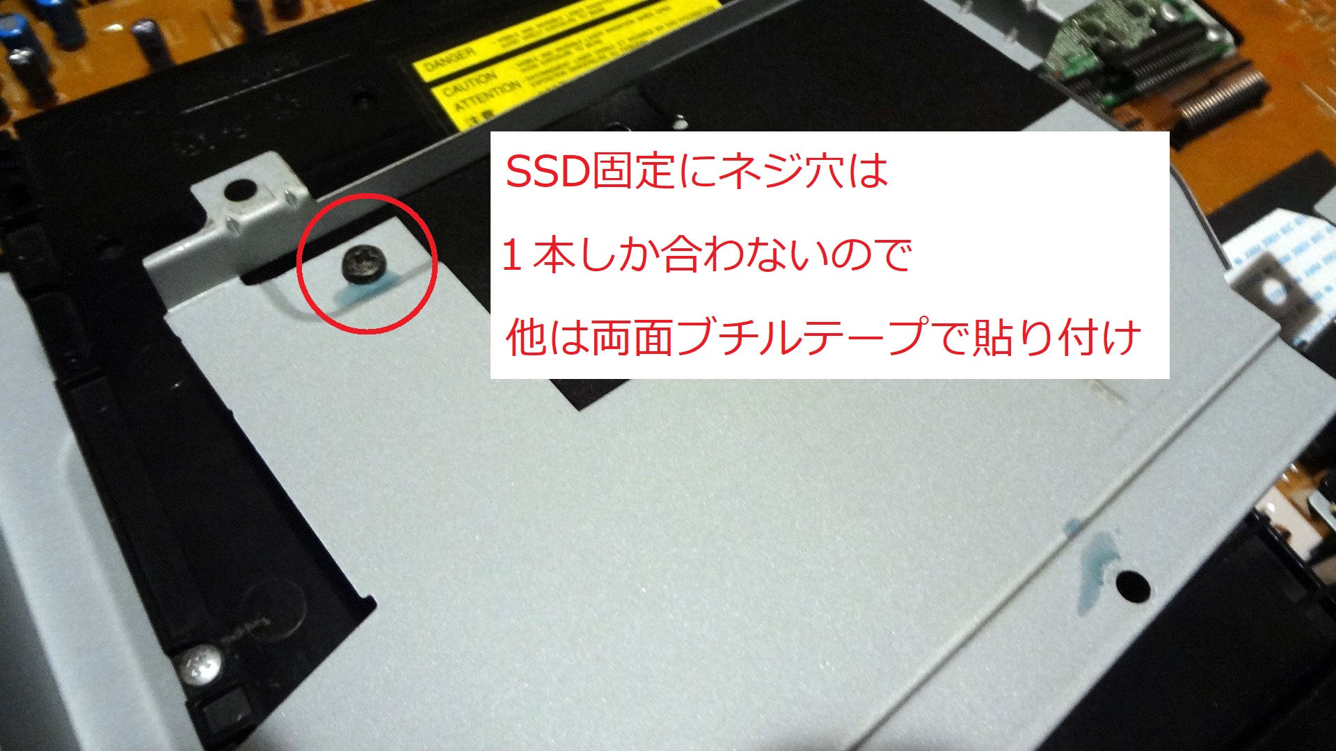 ⑥SSDを固定します。といってもHDDとは穴の位置が違うので1本だけネジで固定し、他は角に両面ブチルテープで貼付けました。重量が軽いので問題にならないでしょう。
