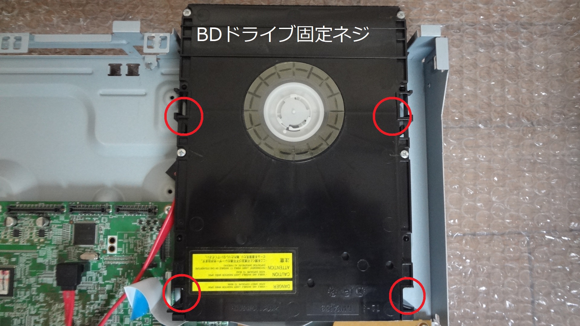 ⑮BDドライブ周辺にあるナベネジ(長)4本を外すとドライブが外れます。