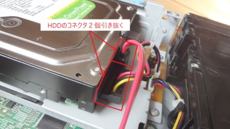 ⑧ハードディスクを外します。ハードディスクに差し込んである黒色のコネクタを2本抜き外します。