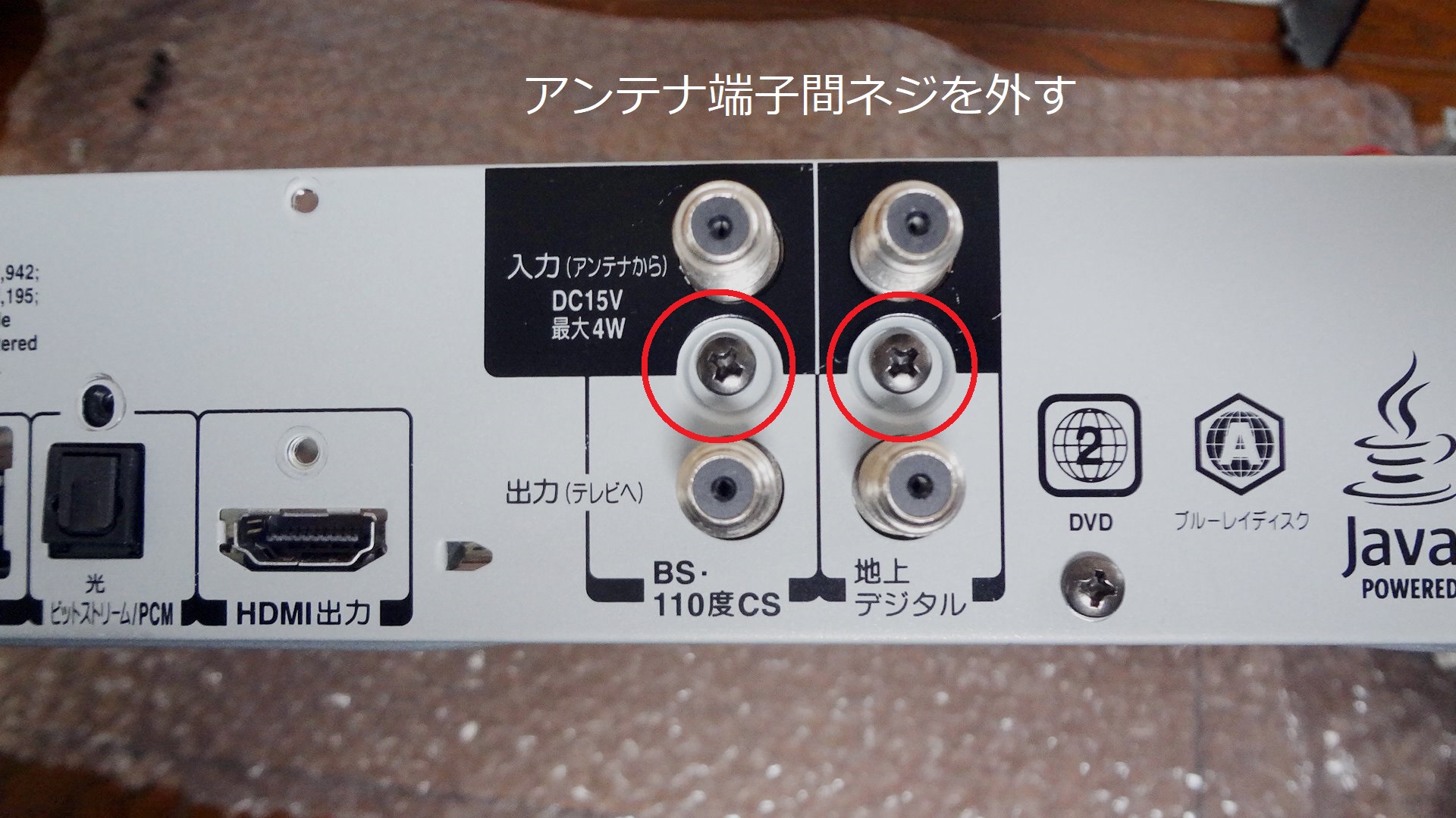 続いて、アンテナ端子の間にある黒色ナベネジ(短)2本を外しますが、アナログ基盤同様、ケースの裏面板に基盤が引っ掛かっていて外せないので、次の手順⑱で外れます。