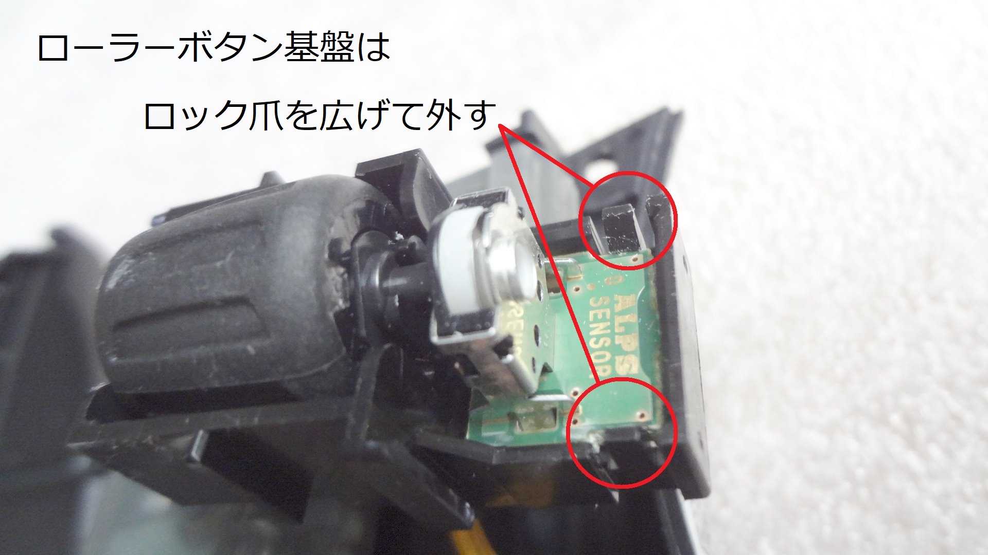 この基盤を留めている樹脂製のツメ2ヵ所を広げて基盤を外します。