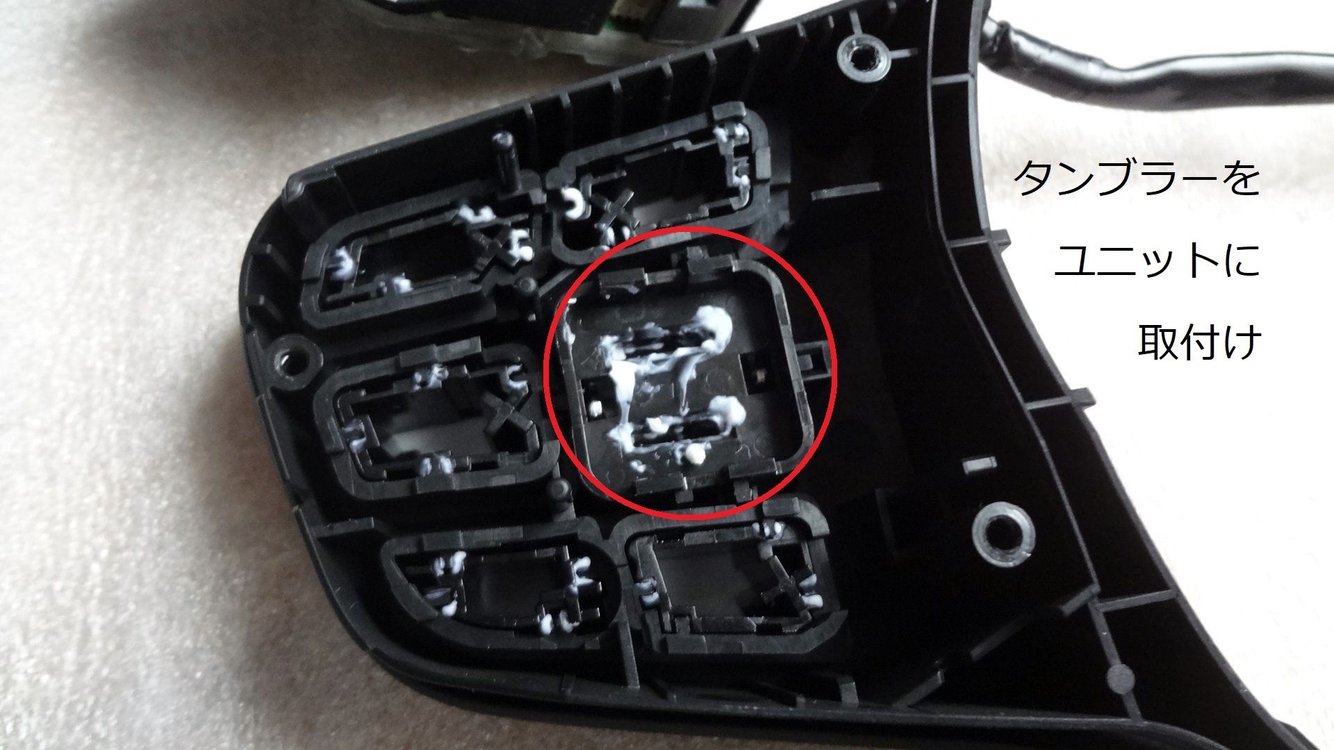 左右スイッチユニット間の配線をステアリング上部に沿ってガイドに押し込んでいき左スイッチユニットを差し込みます。