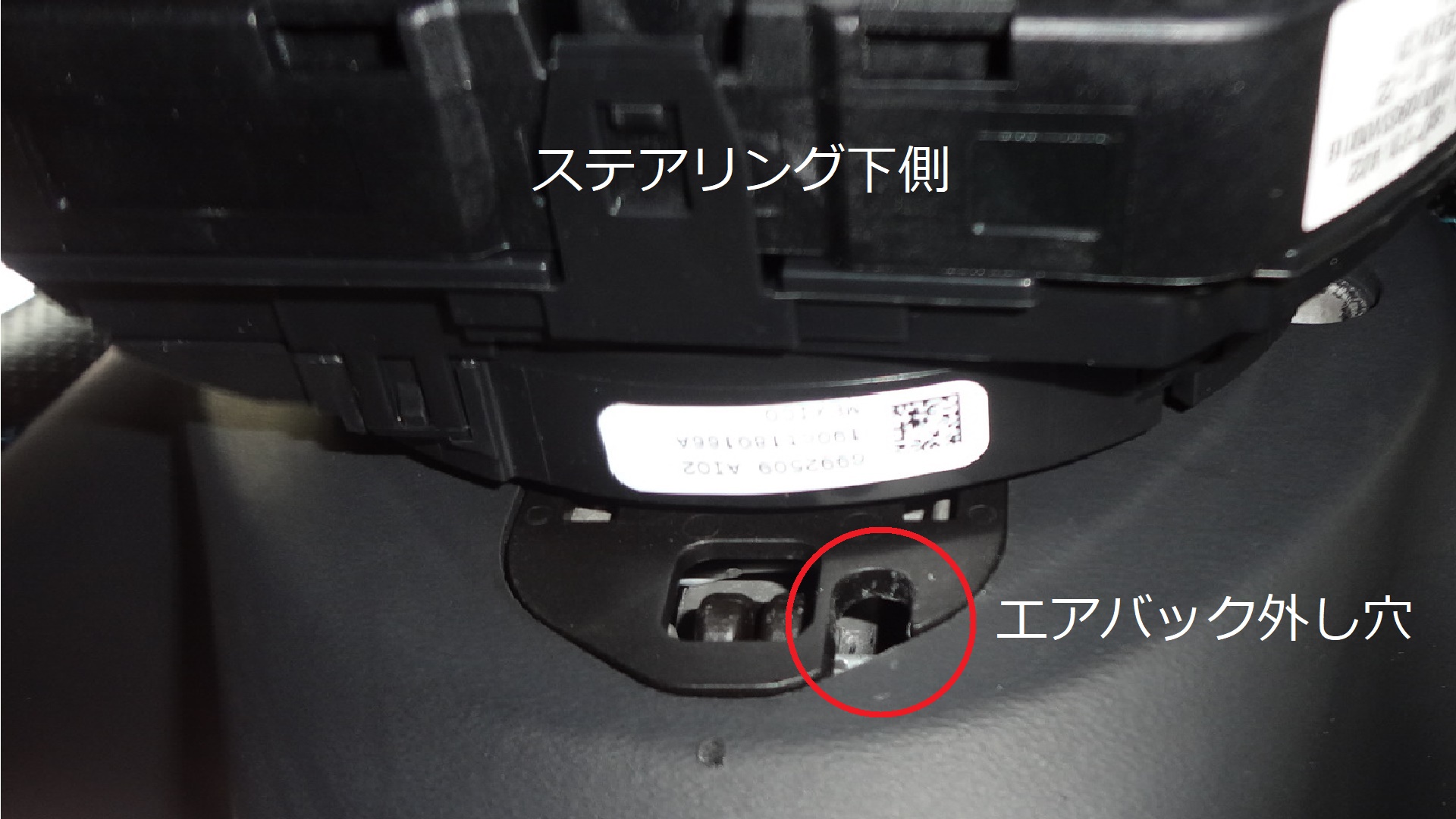足元からステアリング下(裏側)を覗くと2つ細長い穴が見えます。小さい方の穴にマイナスドライバーを差し込んで、エアバックを手で支えながらドライバーを下方向へ下げ、内部にあるバネを押し上げたままエアバック下部を指で引くと、エアバックの下部だけが浮きます。