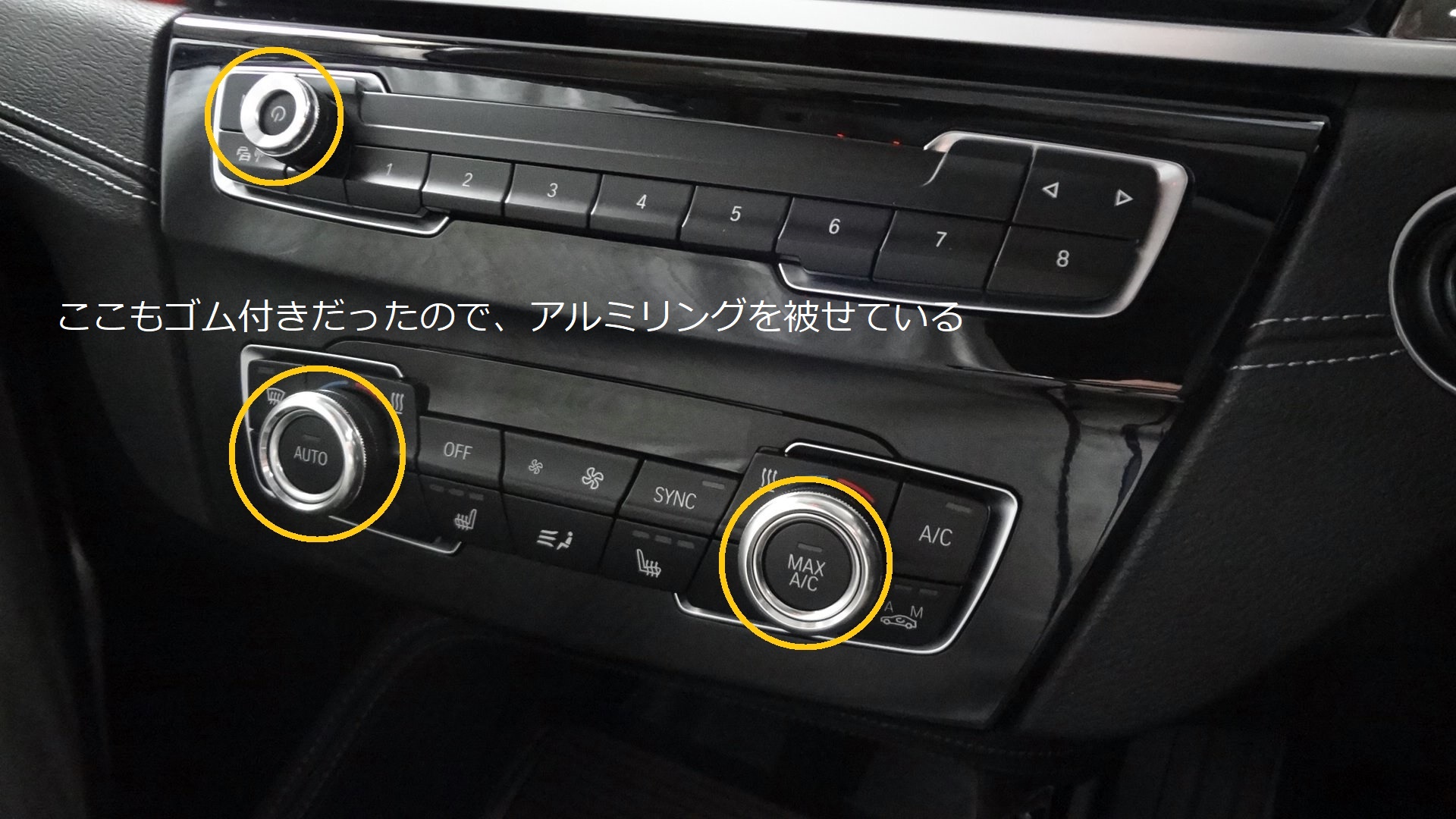 これまでも同じようにホコリが付きやすかったゴムのついたボリュームとエアコンダイヤルにはアルミ製のリングカバを付けています。(ノーブランドですが。)