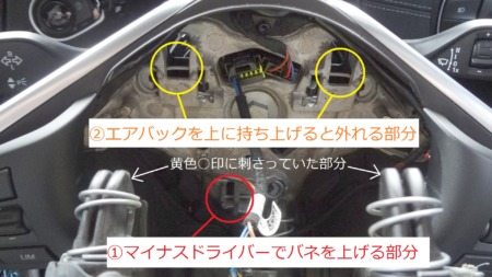 ⑥エアバックを両手で側面を支えながら、上方向に押し上げるとエアバックは外れます。下の画像は外す時には見えないですが、動きとして①がドライバーでこじてバネを引き上げた時に外れ、②がエアバックを上に持ち上げると外れる動きになります。