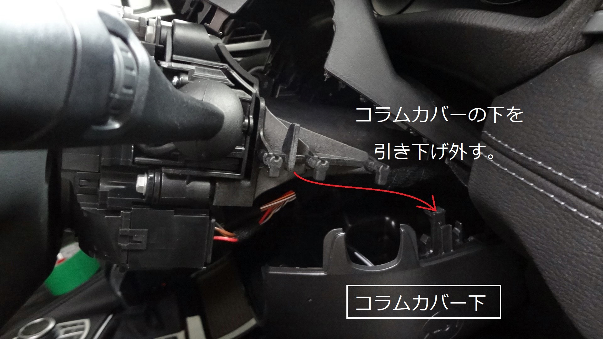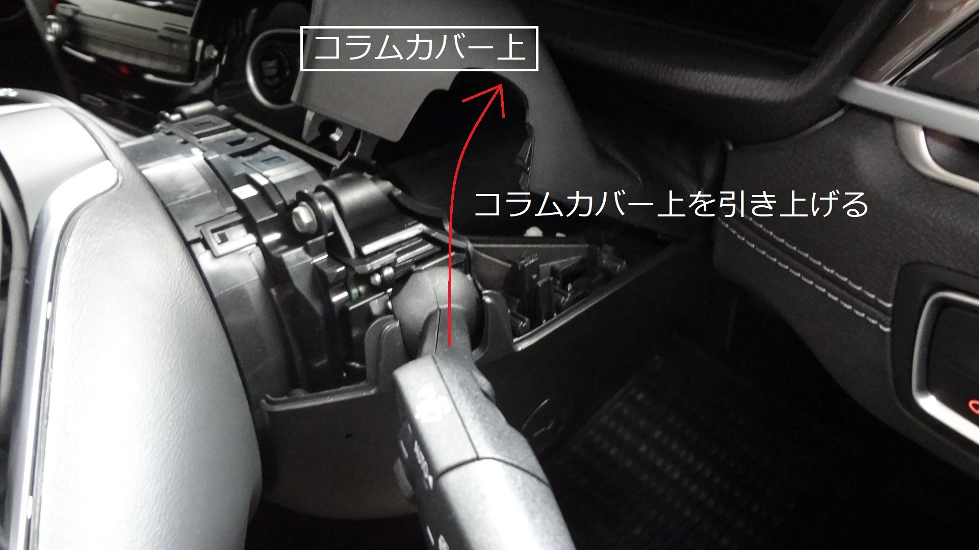 ネジは使われていません。先に上部カバーを外します。ウィンカーとワイパーレバー穴をきっかけに上に引き上げるように剥がし、根元は付いたままで大丈夫です。
