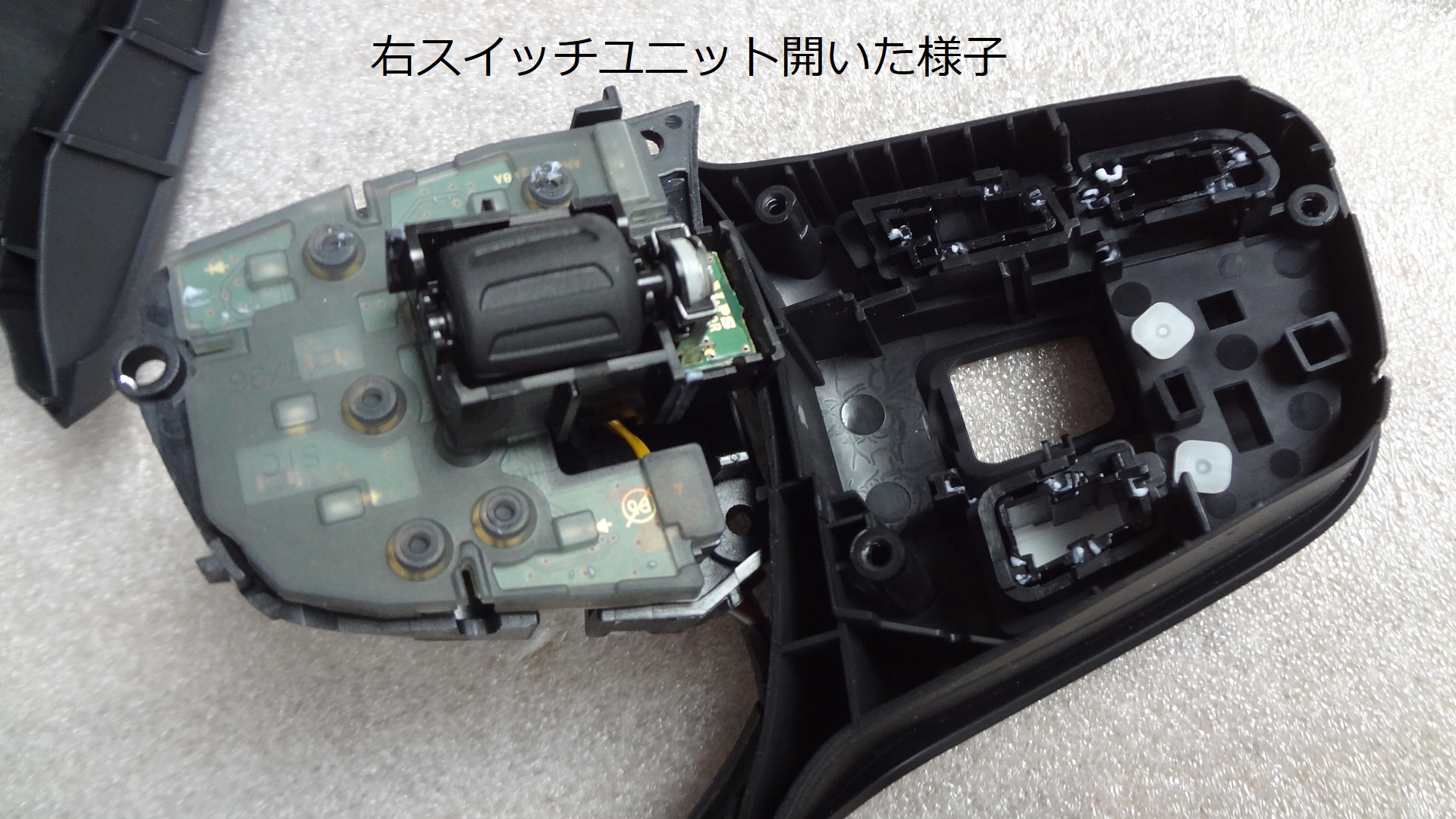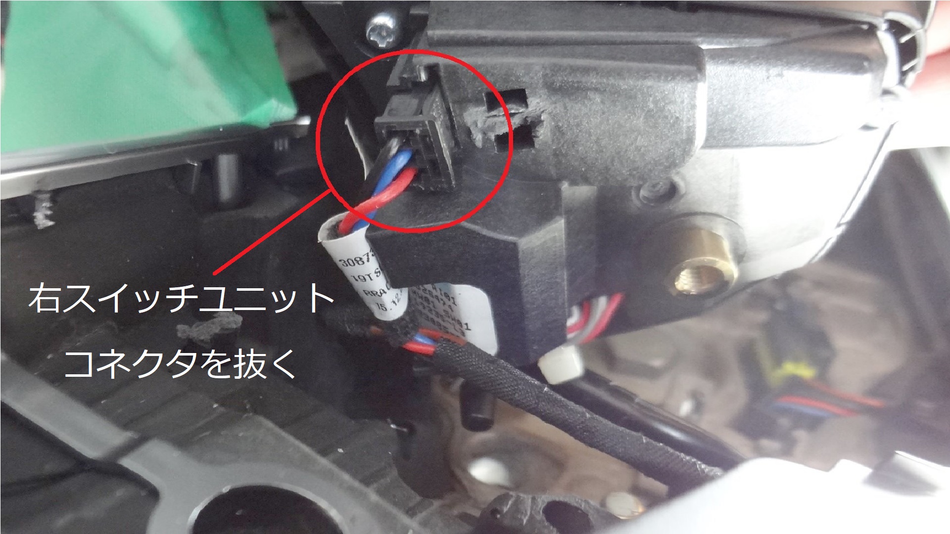 右スイッチユニットを引き抜き、裏面に差し込んであるコネクタを1ヵ所抜きます。